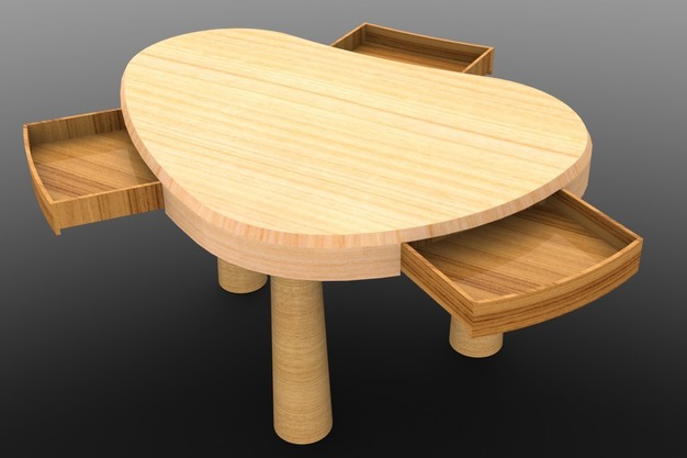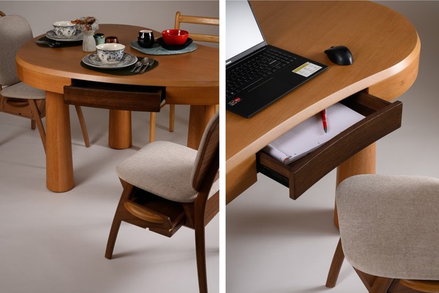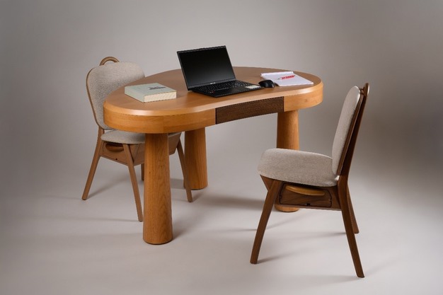 The Table Perriand's structure reflects this philosophy. Its three solid oak legs, wide at the base and tapering toward the top, create a sense of stability and humility while evoking progression through shared knowledge. The top surface, divided into three organically flowing sections, provides both shared space and personal zones, balancing collaboration with individual focus.