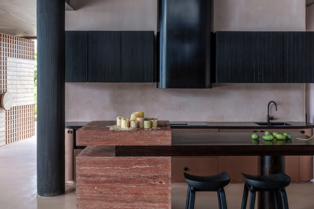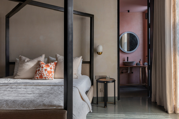 The home unfolds with quiet restraint: walls coated in pink lime plaster and floors of cool oxide establish a soft, grounding palette. Natural textures—aged metals, knotted jute, and rich woods—imbue the interiors with warmth, while spaces flow effortlessly from the lounge and dining area to the kitchen, connected by a deck that blurs the lines between indoors and outdoors. Sunlight dances through wooden pergolas, and the pool mirrors the shifting skies, evoking a meditative stillness throughout the property.