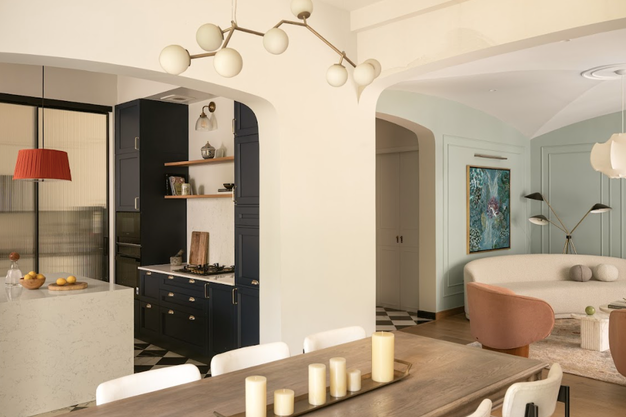 The living room, painted in a gentle sage, is topped by a vaulted ceiling and anchored by organic furniture and a bold custom artwork by Priyanka Aelay. Adjacent, the dining area features a hand-painted watercolor mural, a curved fluted marble-topped bar, and a navy-toned kitchen, blending artistry with functionality.