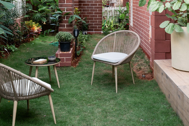 Outdoor spaces extend the villa's serene ambiance. A garden nook framed by red brick walls and tropical planting offers a relaxed seating area, while raised planters, soft lighting, and a manicured lawn reinforce a fresh, grounded atmosphere.
