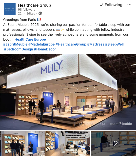 Healthcare Group shared an update on LinkedIn from EspritMeuble 2025, highlighting their presence at the Paris fair. The post showcased the brand's mattresses, pillows, and toppers, emphasising comfort and quality, while also highlighting the opportunity to connect with fellow industry professionals and experience the lively atmosphere of the booth firsthand.