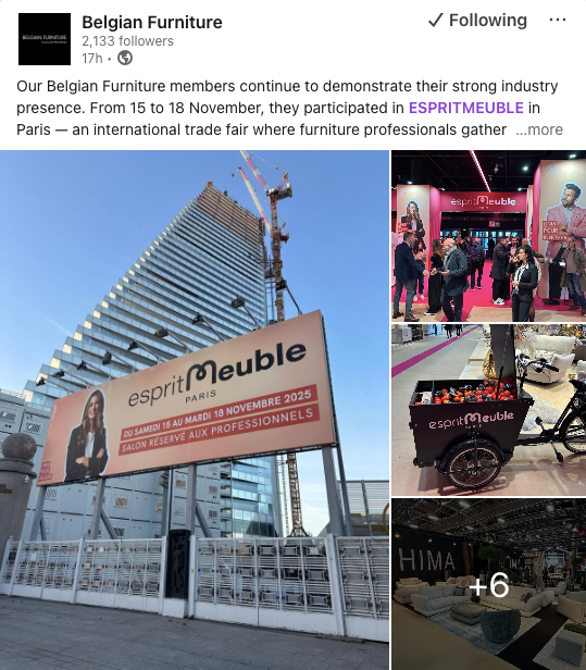 Belgian Furniture shared an update on LinkedIn from EspritMeuble 2025, highlighting the strong presence of its members at the Paris fair. The post showcased brands including Belform, Gerlin by Muusze, Hima, Recor Bedding, Recor Seating, Polypreen België N.V., ROM, and Velda Beds, emphasising their latest innovations, high-quality collections, and commitment to craftsmanship, sustainability, and sector leadership.