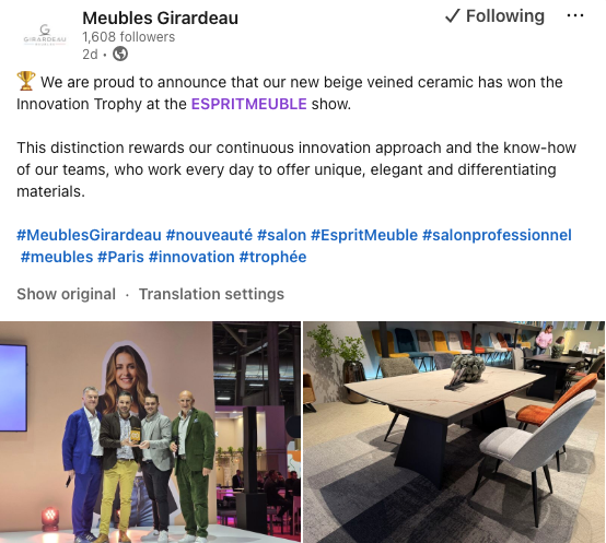 Meubles Girardeau shared an update on LinkedIn from EspritMeuble 2025, celebrating their win of the Innovation Trophy for their new beige veined ceramic. The post highlighted the brand's commitment to continuous innovation and the expertise of their teams, showcasing how they create unique, elegant, and differentiating materials for the interior design market.