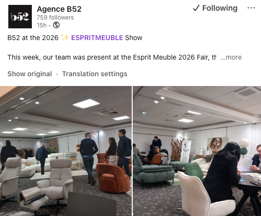 Agence B52 shared an update on LinkedIn from EspritMeuble 2025, highlighting their team's presence at the Paris fair. The post emphasised the opportunity to explore upcoming interior trends, connect with clients such as Château d'Ax and Atlas Home, and gather inspiration to support strategic planning for 2026. Agence B52 underlined the fair's role as a key event for industry networking and trend insight.