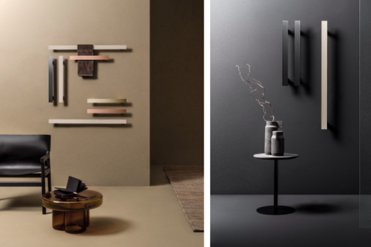 They can also create abstract compositions with Tavolina, a minimalist 3 mm-thick plate available in 40, 50, 60 or 100 cm lengths, which can be installed horizontally or vertically, becoming a practical system for storing towels or hanging bathrobes. The mix of gold, copper, and glossy black, together with other shades from the Colour Chart, creates authentic wall installations, customisable to achieve the desired thermal comfort.