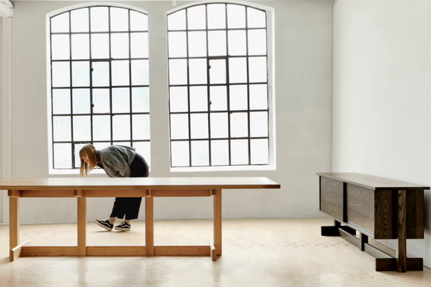 Aas drew inspiration from the pastoral landscapes surrounding her studio in Bergen. This influence is evident in the robust timber construction, trestle bases and traditional joinery methods such as mortise-and-tenon and tongue-and-groove joints. The pieces are designed for everyday use and built to last for generations.