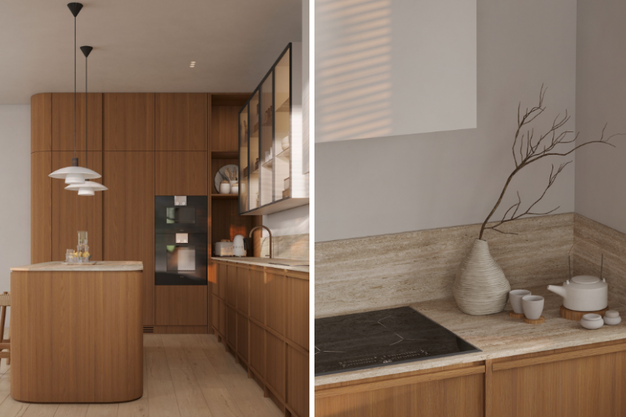 Unlike the previous collection, Kyoto, Forma introduces a row of upper glass-front cabinets with soft internal lighting. These create a gentle, warm glow and provide a curated space to display dishes, ceramics, and everyday essentials.