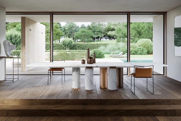 Ellenico was designed by Enzo Berti, who also created Kreoo's Arcaico table. It's a monumental piece of furniture that can reach lengths of over 4 metres, as the structure is composed of alternating marble and metal cylinders with bronze finish. The base alludes to the theme of classical columns and its elegant solidity contrasts with the stone top: it appears almost suspended and even more slender thanks to the thin edge finish.