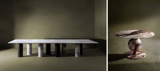 Arcaico table in White Carrara marble, designed by Enzo Berti (left) and King table in Calacatta Emotional marble, designed by Christophe Pillet.