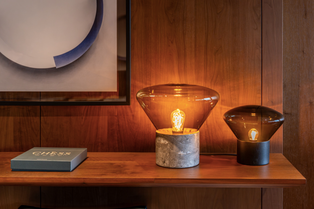 At the entrance, visitors are greeted by Muffins, the renowned lighting collection by Lucie Koldova and Dan Yeffet. Presented in smoke-grey hand blown glass paired with an American walnut base, the pieces introduce a warm, sculptural presence that complements the hotel's contemporary material palette.