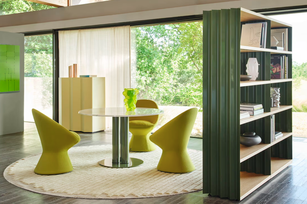 - Marcuso by Marco Zanuso – a re-edition celebrating the brand's heritage. The iconic table, originally featuring a stainless steel frame and round glass top (available in diameters from 120 to 150 cm), now also offers marble and lacquered MDF tops in contemporary colourways, combining technical mastery with expressive versatility.