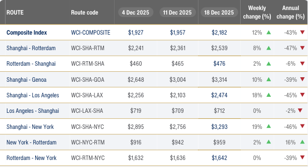 On the Transpacific headhaul, spot rates from Shanghai to New York climbed 19 percent to $3,293 per 40ft container, while rates to Los Angeles increased 18 percent to $2,474 per 40ft. Meanwhile, Asia–Europe routes saw similarly strong growth, with Shanghai to Genoa rising 10 percent to $3,314 per 40ft and Shanghai to Rotterdam up 8 percent to $2,539 per 40ft. Drewry notes that the stability and upward trajectory of these rates over the past three weeks reflect a shift in seasonal patterns, establishing strong year-end volumes as the 'new normal.'