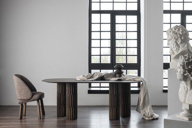 The EON table pays homage to the grandeur of ancient architecture. Its base, composed of perfectly polished wooden cylinders, is artfully offset to create a rhythm that evokes the essence of breath. This asymmetry transforms the table into a metaphorical mechanism of an eternal calendar, reminding us of the passage of time. EON encapsulates the elegance of precision and infinity, crafting an inviting atmosphere that speaks volumes without uttering a word.