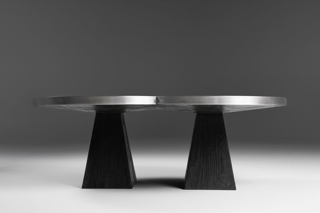 The rough-textured base transitions into a smooth tabletop through two intersecting, perfectly circular shapes. Their intersection represents the fragility of the otherwise massive furniture piece, enhanced by a mirrored surface.