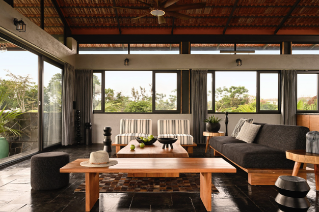 Set on a 4034 sqft built area, the architecture is light and porous, blurring the boundary between built form and lush natural surroundings. Deep overhangs and shaded volumes ensure comfort in the tropical climate, while the east-facing public zones, including the pool deck, living area, and kitchen, are flooded with natural light through extensive glazing. Bedrooms are positioned to the west, protected from harsh afternoon sun, creating a balance between openness and privacy.