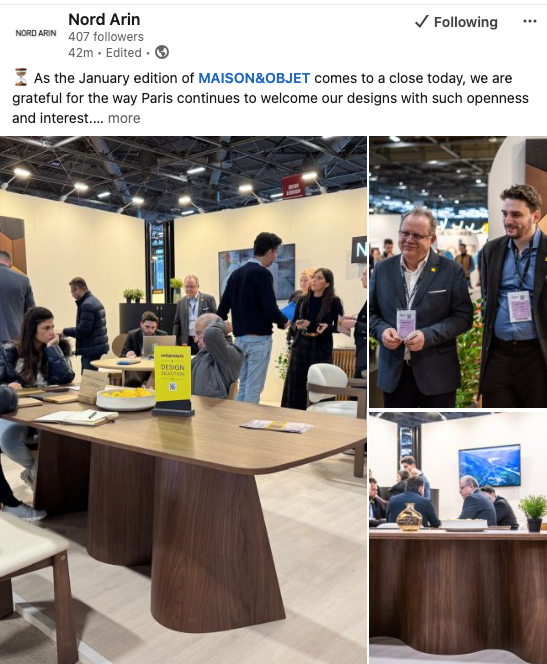 Nordarin, wraps up the January edition of Maison&Objet 2026 in Paris, and expresses gratitude for the warm reception of its designs and the positive feedback exceeding expectations. They highlight ongoing conversations started at the fair and look forward to turning those into meaningful projects and long‑term collaborations with partners and agencies.