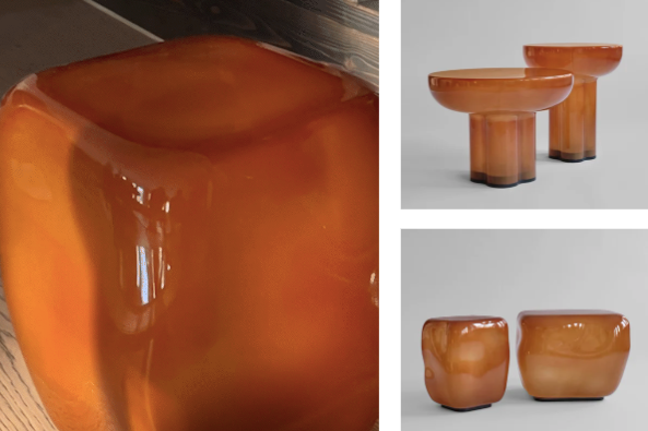 Both the Ishi and Crown tables are crafted from mouth-blown glass, a technique that ensures each piece has its own unique character. The glossy finish subtly catches and reflects light, enhancing the warmth of the Caramel tone and reinforcing the tables' sculptural quality. Whether used as a focal point or as part of a layered interior composition, the tables function as statement pieces that combine material artistry with everyday functionality.