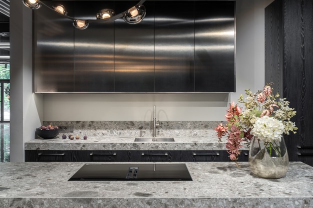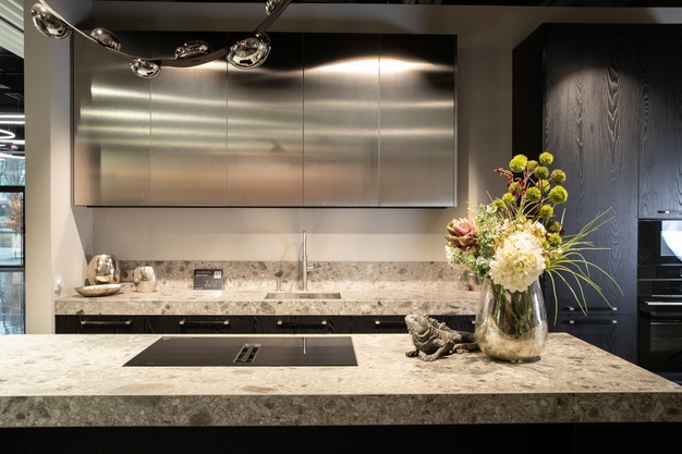 The upper cabinets finished in metallic Homapal immediately draw attention. Their reflective surface introduces an industrial edge while adding sculptural elegance to the composition. Depending on lighting conditions, the metal subtly shifts in tone, bringing movement and depth into the space. This finish contrasts intentionally with the darker, more grounded elements below, elevating the overall perception of the kitchen.