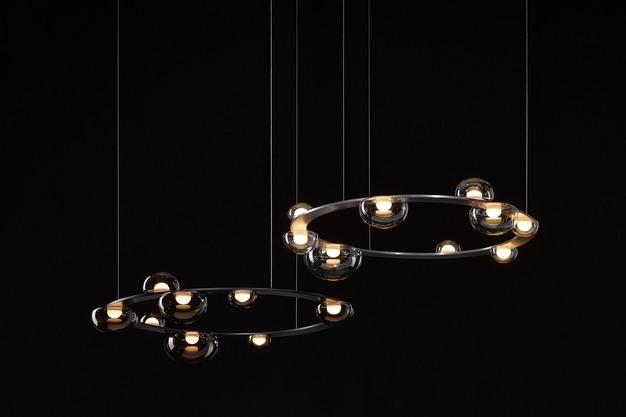 The Ollo lamp is designed as an intimate, portable light, its circular glass ring enclosing tiny bubbles that resemble stars. Designer Václav Mlynář describes it as "a light that lives with you," offering adjustable intensity and colour temperature (1850K–4000K) and a rechargeable USB-C battery for effortless portability. Available in bronze, silver, and anthracite, Ollo combines personal ambiance with sculptural elegance.