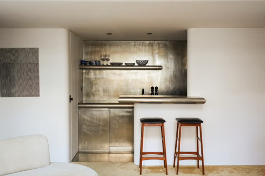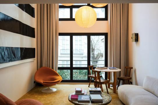 Renovated by Belgian architect and interior designer Olivier Dwek, the 75 sqm apartment accommodates up to four guests across two bedrooms and two bathrooms. Set back from the street and overlooking a quiet inner courtyard, the west-facing apartment offers a calm retreat from the lively surroundings of Saint-Germain-des-Prés. Its spatial centrepiece is a distinctive living area with a ceiling height of 5.5 metres and large picture windows that flood the interior with natural light. Comfort is enhanced through discreet features including underfloor heating, air conditioning and secure access.