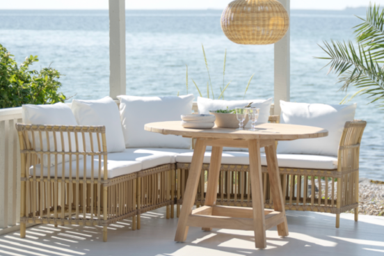 Modularity is central to the Meghan Modular Dining Bench, which adapts to a variety of outdoor layouts. Comprising a corner module and a centre module, the bench offers the same seating height as standard chairs while creating a cosy dining alternative. After meals, the modules can be reconfigured into a comfortable reading nook, with the back cushions removed and the armrest serving as support.