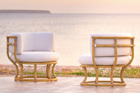 The collection also reimagines classic lounge designs for outdoor use. The Pacifique Exterior Lounge Chair, designed by Michel Buffet in 1954, is handcrafted in aluminium and ArtFibre. Its hand-painted aluminium frame mimics the warmth of rattan, providing a large, embracing seat ideal for relaxation. Similarly, the Coco Exterior Lounge Chair, designed by Nanna Ditzel in 1973, adapts circular and semi-circular motifs into an aluminium and ArtFibre frame, hand-painted to resemble rattan, merging geometric elegance with outdoor functionality.