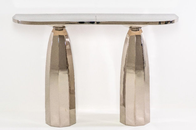 With Coretta, Leleu revisits an iconic occasional table from the Maison's archives, transforming it into a manifesto console. By inverting volumes and reinterpreting its original function, the piece offers a contemporary reading of collectible furniture. Crafted in raw ceramic and finished in platinum, Coretta reveals unexpected material qualities, producing subtle chiaroscuro effects and infinite visual variations. Positioned between design and sculpture, the console asserts a strong architectural presence while maintaining refined delicacy in its execution.