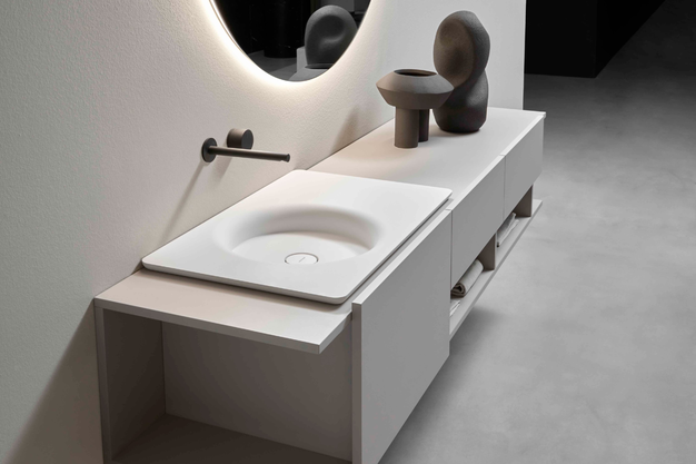 With Carpet, antoniolupi continues its exploration of integrated and monolithic bathroom solutions, reinforcing the brand's commitment to research-driven design. The result is a sophisticated washbasin top that merges formal essentiality with advanced manufacturing techniques, giving architects and designers a highly adaptable tool for creating bespoke bathroom spaces.
