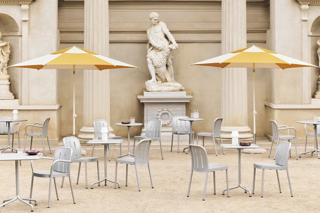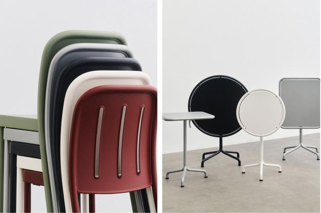 Designed by Julien Renault, the Deville chair and armchair reinterpret the classic bistro style with softly curved frames and generous proportions for comfort in cafés, restaurants, and terraces. Made from at least 60% post-consumer recycled aluminium, the chairs are lightweight, rust-resistant, and stackable. The matching Deville tables feature a tilting tabletop for easy storage, with round or square options.