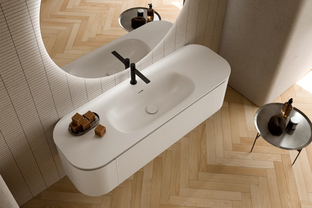 Characterised by fluid forms, continuous lines and refined detailing, the new curved terminals bring a softer, more organic expression to contemporary bathroom furniture. Designed as a natural extension of the Tulle system, these elements move away from rigid geometries, offering a more harmonious and enveloping presence within the space.