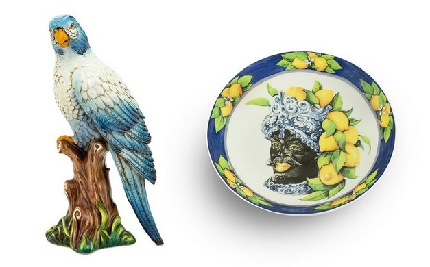 On the left: the hand-painted Parrot, and next to it: the Plate Moro Head, celebrating the most authentic soul of Sicily.