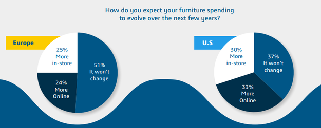 Consumers increasingly expect hybrid shopping experiences that blend online inspiration with in-store validation. U.S. shoppers are more digitally confident at every stage of the journey, with 43% of furniture spending happening online, compared to 21% in Europe. Europeans, while digitally active, 80% start their journey online, tend to switch to in-store channels for reassurance before making purchases. The path to purchase typically includes three phases: inspiration, in-store validation, and final purchase, though the emphasis on each phase differs by region.