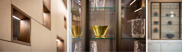 Glass continues to define zones within open-plan kitchens without introducing physical barriers. Two main trends are emerging: coloured glass in warm, earthy and near-black tones, and fluted or reeded glass fronts that reinterpret structured cabinetry. Smoked brass glass and fluted panels are positioned as alternatives to conventional handleless units, offering texture and a layered visual effect.