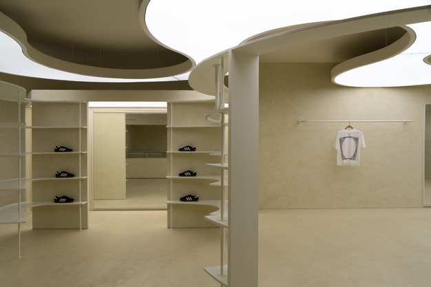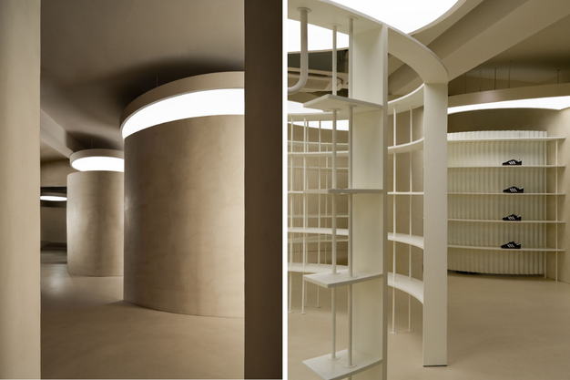 On the ground floor, a continuous, spiralling element structures the space, functioning simultaneously as display, circulation, and spatial anchor. Sneakers are integrated into the architecture rather than presented as isolated objects, "encountered from multiple angles as visitors move through the space." Visitors navigate intuitively, with no prescribed paths or clear beginnings and ends, encouraged to slow down, turn, and retrace their steps. A subdued material palette of muted tones, soft finishes, and controlled lighting ensures the environment foregrounds form and product without distraction.