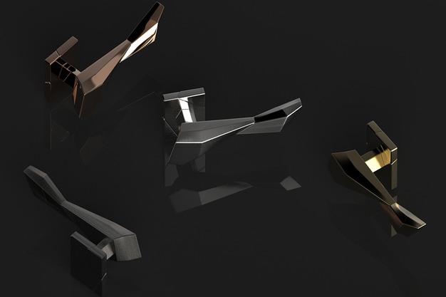 The handle's faceted geometry captures both natural and artificial light, creating visual depth and transforming doors into active architectural elements. Finishes, including brushed nickel, bronze, satin chrome, and gold, enhance its material presence, allowing integration or contrast in luxury interiors such as hospitality projects and executive offices.