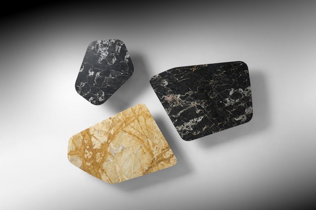 The tabletops emphasise the expressive qualities of marble, allowing the natural veining of the stone to unfold across sculptural surfaces. In contrast, the bases introduce a more architectural language, formed by two curved metal planes that approach one another without touching, creating a visual tension between balance and suspension.