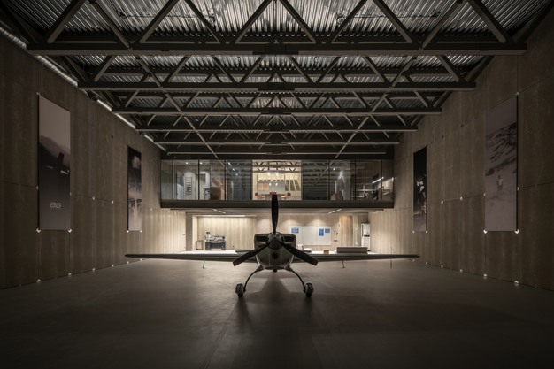 The project centres on a full-height hangar hall designed to accommodate light sport aircraft. Its structure is intentionally exposed, revealing steel trusses, corrugated metal roofing and visible technical systems, reinforcing the building's industrial character.
