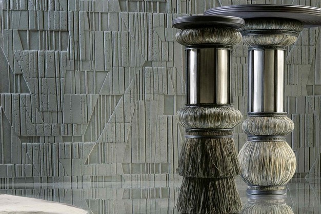 The installation features life-sized artworks created by Gabriela de Sagarminaga, who translates imagery from ancient Egypt into sculptural pieces made from grass and natural fibres. Her work merges traditional fibre techniques with architectural expression, creating tactile compositions that blur the boundaries between art and interior surfaces.