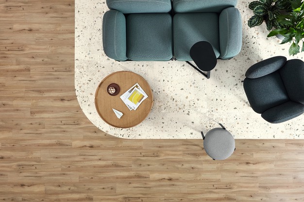 Alongside wood finishes, Spacia Stones combine classic natural references with more contemporary aesthetics. The range includes timeless stone textures, embedded concrete effects and refreshed terrazzo designs, offering designers additional options for zoning and visual interest in larger commercial environments. The updated selection also reintroduces classic marble tones, including a timeless black-and-white palette.