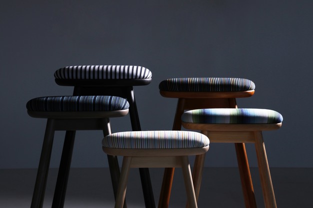 The textile is applied to several pieces, including the Coupé stool, one of the brand's most recognisable designs. In its new configuration, with a black frame and contrasting upholstery, the stool adopts a more sophisticated aesthetic compared to the original version in light wood with colourful fabrics. This reinterpretation expands the design's versatility, enabling it to integrate more naturally into refined interior environments.