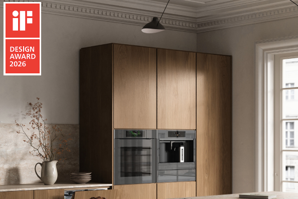 The ovens integrate a wide range of functions, including full steam cooking and microwave capabilities, accessible through a large TFT touch interface designed to simplify operation. The appliance features a distinctive pearl-effect glass front with polished edges, framed by precision-milled profiles that connect seamlessly with kitchen furniture. Available in Pearl Grey and Pearl Black, the ovens are designed to integrate naturally into contemporary high-end kitchen interiors.