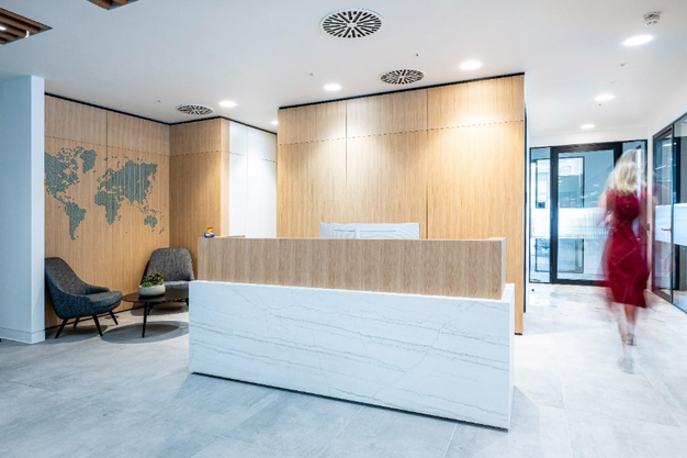 Natural elements play a central role in the design. Oak veneers were used extensively across wall panelling, the reception area and café spaces, introducing warmth and texture throughout the workplace.