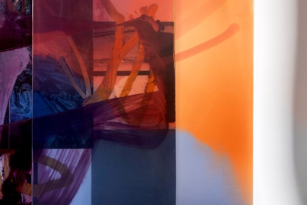The project explores the concept of the sliding door as both a functional and expressive element. At its core is a diptych by Aurel K. Basedow, positioned behind a series of lucite panels painted with epoxy resin by Draga Obradovic. These translucent panels glide along parallel tracks, continuously altering the viewer's perception of depth, colour and rhythm.