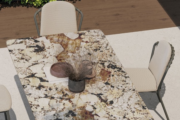 Completing the launch is Mentha, a table inspired by Art Nouveau and reinterpreted in a contemporary language. Featuring a distinctive slotted aluminium column and a stainless steel base, the design combines sculptural presence with structural stability. Its technical ceramic porcelain top makes it suitable for both indoor and outdoor environments.