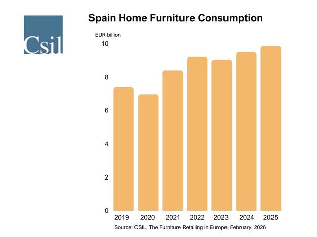 While much of Europe is experiencing a complex and cautious environment, Spain's home furniture market continues its steady climb. Since 2019, total consumption has grown at an average rate of nearly +5% per year, and the outlook remains comparatively strong, outperforming the broader European average. This is written by Giulia Taveggia, Partner and Senior Researcher at the Italian research institute CSIL.