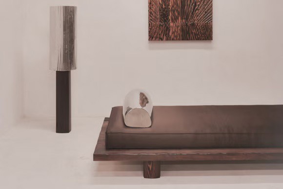 The installation introduces new works by Van Orshaegen, alongside collaborative pieces developed with Van Meerbeeck. Materials such as solid oak, mahogany, aluminium, rock crystal, and textiles are explored across the collection, reflecting a focus on materiality and craftsmanship.