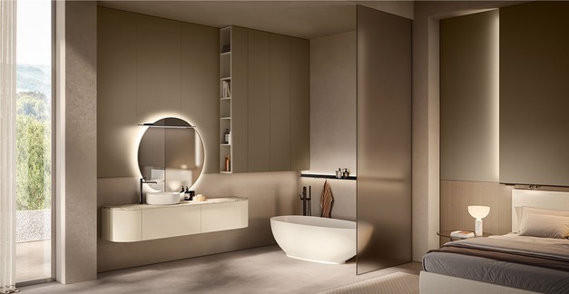 A key feature of the showcase is Flair, a new 2026 kitchen and bathroom system. Defined by soft geometries, curved detailing, and balanced proportions, the design introduces a more fluid and tactile aesthetic aimed at creating warm and adaptable interiors.