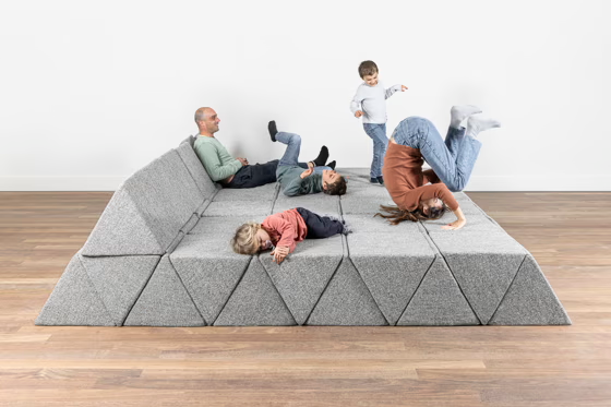 Inspired by alpine topography, Peaks is composed of triangular modules that can be rotated and repositioned to form backrests, seating platforms and armrests. This system allows users to adapt the configuration for different uses, from informal lounging to more structured social arrangements.