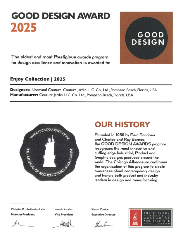 The ENJOY Collection by COUTURE Jardin has been named a recipient of the 2025 GOOD DESIGN Award, as confirmed by The Chicago Athenaeum: Museum of Architecture and Design and The European Centre for Architecture Art Design and Urban Studies.