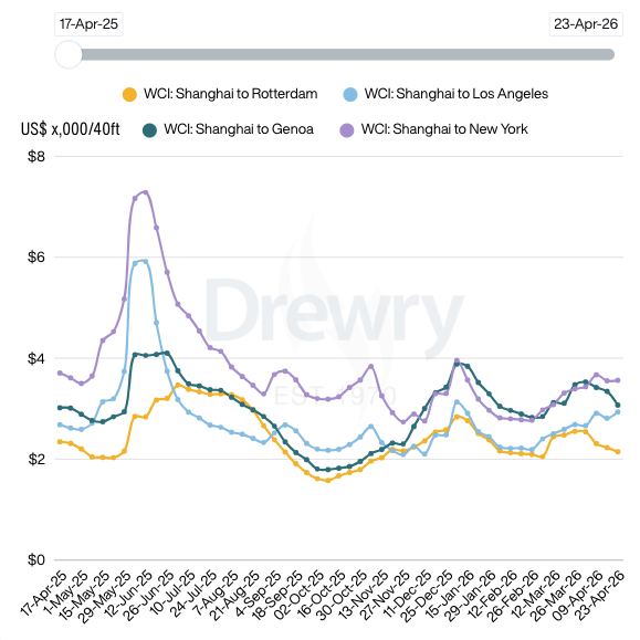 The index fell 1% to US$2,232 per 40ft container on 23 April, reflecting softer pricing on the Asia-Europe trade despite higher fuel costs and previously announced war-risk surcharges linked to disruption around the Strait of Hormuz.